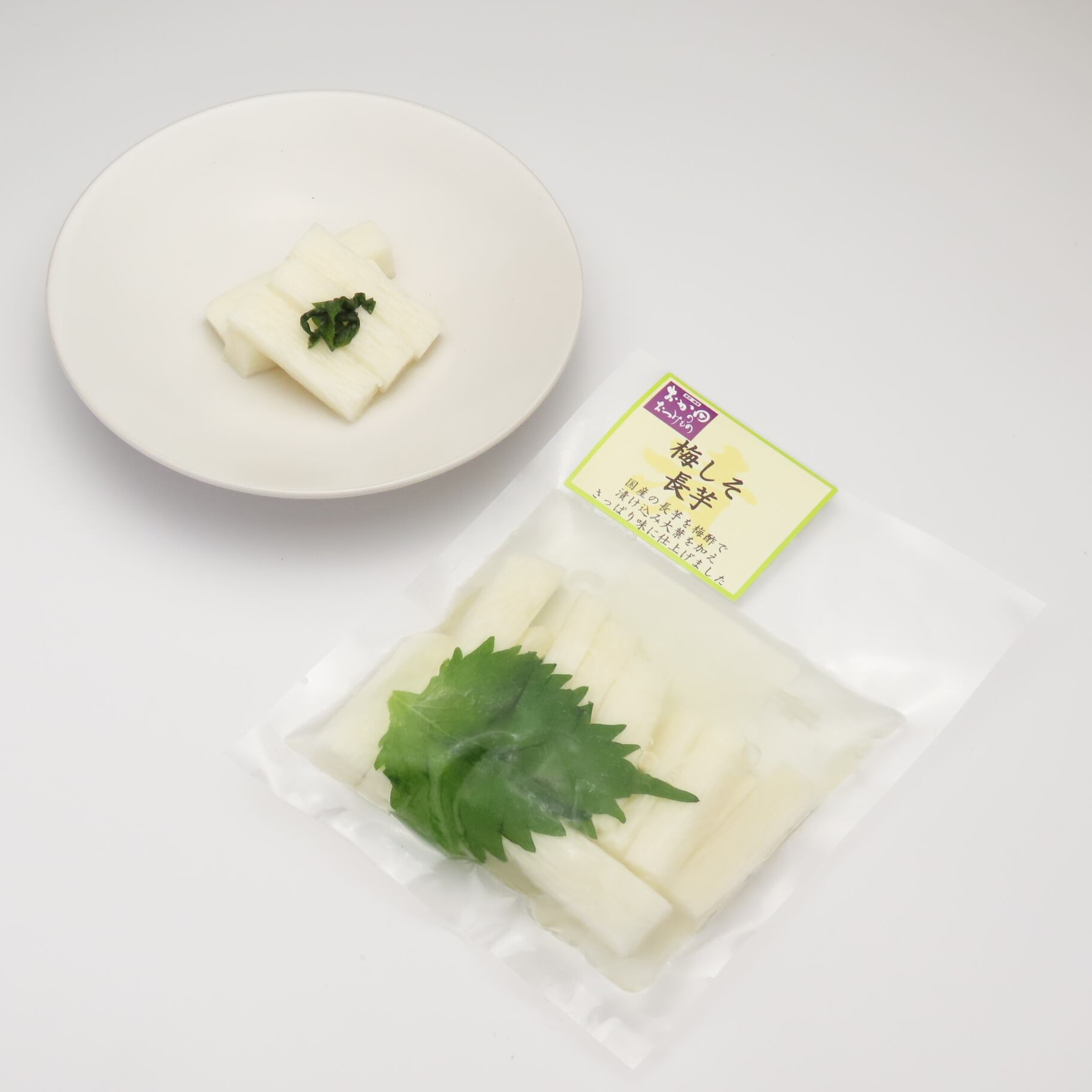 原材料:長芋(国産)、大葉(国産)、漬け原材料[食塩、醸造酢、梅酢、還元水あめ、しいたけエキス、蛋白加水分解物、酵母エキス]/調味料(アミノ酸等)、pH調整剤、酸味料、香料、環状オリゴ糖、(一部にりんご・やまいもを含む)