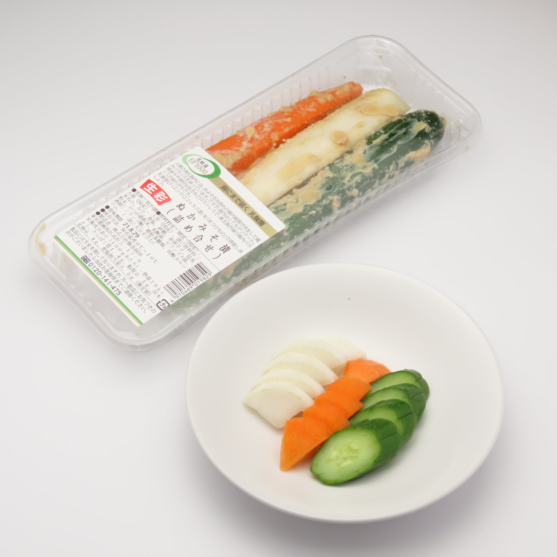 原材料:胡瓜(国産)、大根(国産)、人参(国産)、漬け原材料[米ぬか、みそ、食塩、砂糖、赤唐辛子、昆布粉末、かつお節粉末、乳酸菌、ビフィズス菌、酒精]/リンゴ酸、増粘多糖類、炭酸カルシウム、(一部に大豆を含む)