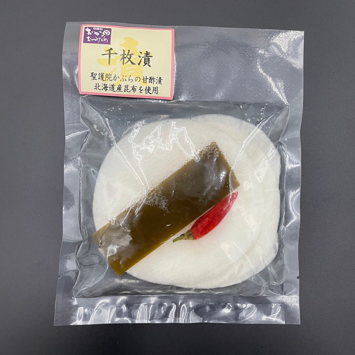 原材料:聖護院かぶら(国産)、昆布(国産)、唐辛子、漬け原材料[糖類(砂糖、異性化液糖)、醸造酢、食塩、みりん、発酵調味料、昆布だし、蛋白加水分解物、酵母エキス]/調味料(アミノ酸等)、酸味料、(一部にりんごを含む)
